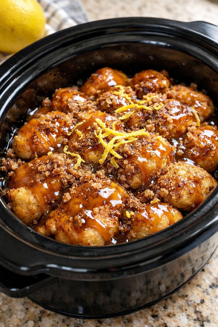 Once done, turn off the slow cooker and let the dessert stand, covered, for about 5 to 10 minutes to allow the bubbling to settle and the sauce to thicken slightly.