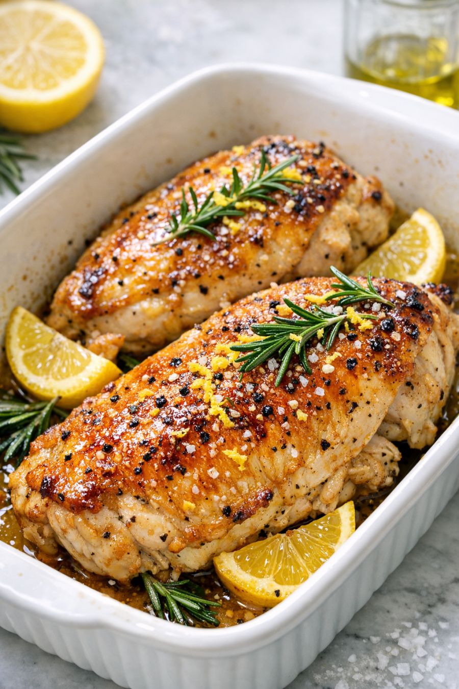 You can keep the 4-ingredient framework and still play a bit within it. For a more herb-forward version, swap half of the salt for a seasoned salt or a favorite poultry seasoning blend (just be sure it includes salt so you don’t need extra). If you prefer a touch of heat, use a lemon-pepper seasoning in place of plain salt and add a few grinds of black pepper, keeping the total count at four ingredients. For a slightly richer profile, replace the olive oil with melted unsalted butter; the butter will brown around the edges of the dish and deepen the flavor of the pan juices. If you have extra lemons, tuck a few thin slices around the chicken before roasting for a more pronounced citrus aroma.