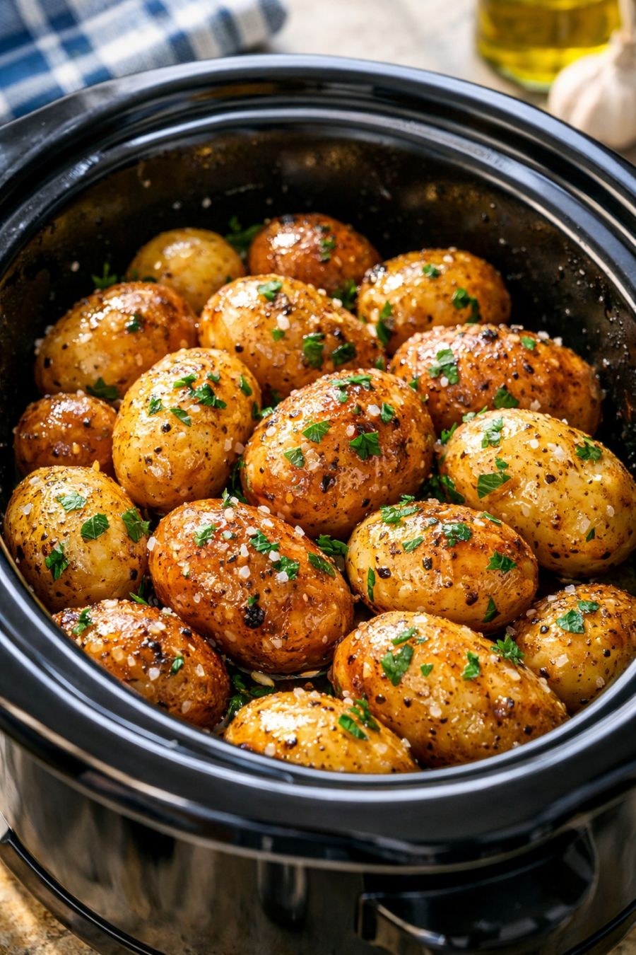 Once cooked, gently spoon the buttery juices from the bottom of the slow cooker over the potatoes. Taste and add a pinch more salt if needed. Sprinkle with black pepper if you like.
