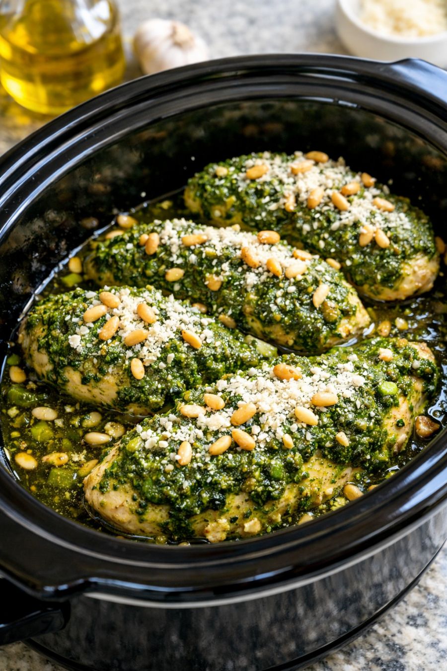 Serve: Slice or shred the chicken and return it to the slow cooker, tossing it gently in the warm pesto sauce, or plate the chicken and spoon the sauce over the top. Serve with lemon wedges for squeezing over just before eating, if you like a brighter finish.