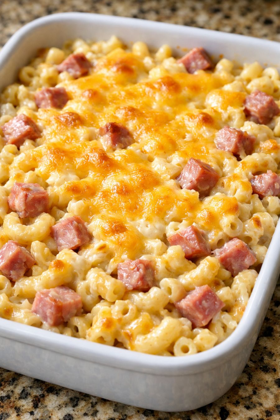 For extra flavor, you can stir 1/2 teaspoon of dry mustard or a pinch of smoked paprika into the milk mixture before pouring it over the macaroni. If you like a little crunch on top, uncover the casserole during the last 10–15 minutes and sprinkle with 1/2 cup of buttered breadcrumbs or crushed saltine crackers. You can also swap part of the cheddar for Colby, Monterey Jack, or a bit of Swiss for a different, but still very Midwestern, flavor. If you prefer a richer dish, replace 1 cup of the milk with half-and-half or evaporated milk. To stretch the meal and add color, fold in 1 cup of thawed frozen peas or corn when you mix everything in the pan. For a smaller household, bake the mixture in two 8x8-inch pans and freeze one after baking and cooling; reheat thoroughly before serving. Food safety tips: Always drain the canned ham well and keep it refrigerated until you’re ready to use it. Wash your hands and any utensils after handling the ham. Make sure the casserole is heated until it is bubbling all the way through and the internal temperature reaches at least 165°F (74°C). Refrigerate leftovers within 2 hours of baking, store them in a covered container, and enjoy within 3–4 days, reheating until hot and steaming before serving.