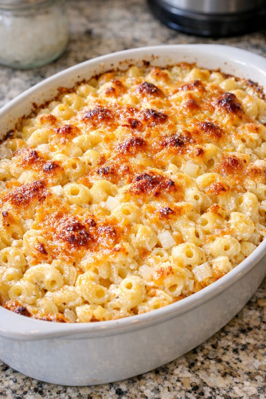 For a little extra flavor without adding more main ingredients, you can stir in 1 teaspoon of mustard (yellow or Dijon) or 1 to 2 teaspoons of sugar to the mayonnaise mixture to lean more into that classic Amish macaroni salad taste. If you like a bit of color and crunch, add up to 1/2 cup of very finely diced celery or bell pepper along with the onion. To make it more of a full meal, fold in 1 to 1 1/2 cups of diced cooked ham or rotisserie chicken after the first 45 minutes of baking, when you uncover and stir the pasta. You can also sprinkle a light layer of breadcrumbs or a small handful of shredded cheese on top during the last 10 minutes of baking for a slightly golden, cozy finish, though it will make it feel more like a casserole than a traditional salad. For a richer version, swap half of the milk for half-and-half; for a lighter one, use a lighter mayonnaise and 2% milk, but keep in mind the sauce may be a bit thinner. Food safety tips: Always keep jarred mayonnaise refrigerated after opening and check the date before using. Because this dish contains both mayonnaise and milk, refrigerate leftovers within 2 hours of baking and store them in a shallow, covered container. Reheat leftovers thoroughly in the oven or microwave until steaming hot, and discard any portions that have been left out at room temperature too long. If you add meat like ham or chicken, make sure it’s fully cooked before stirring it into the dish and reheat those leftovers to at least 165°F (74°C) before eating.