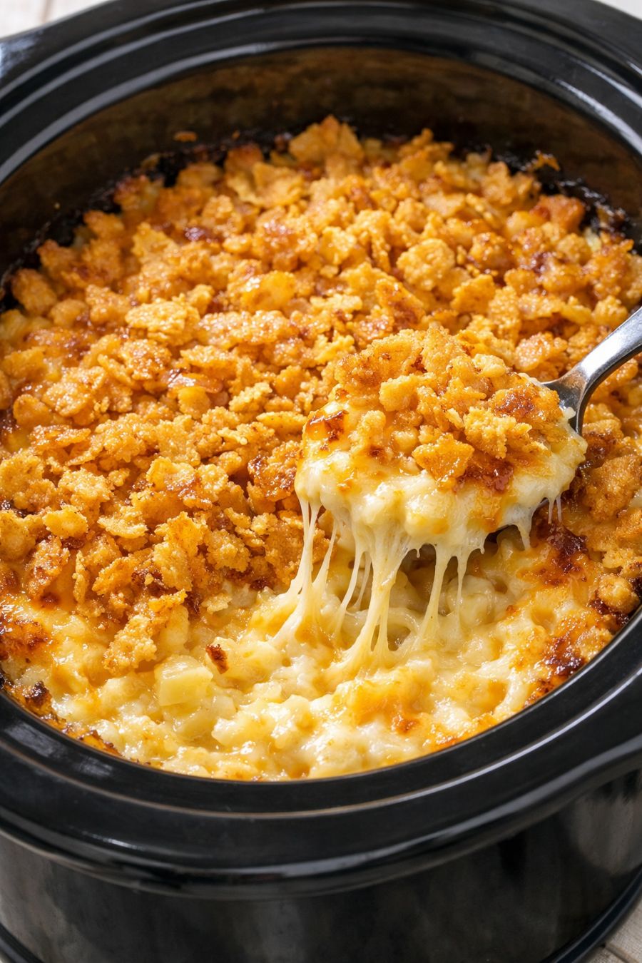 My Aunt Louise brought these potatoes to every single church supper, funeral lunch, and baby shower for over 30 years. She guarded the recipe like it was buried treasure, shooing us grandkids out of the kitchen whenever she made it. When I finally watched closely enough to figure it out, I just about laughed—three ingredients, a slow cooker, and a little patience. What comes out is the kind of creamy, cheesy, golden-topped comfort that tastes like home, the sort of dish that sits quietly on the buffet table and somehow always disappears first.