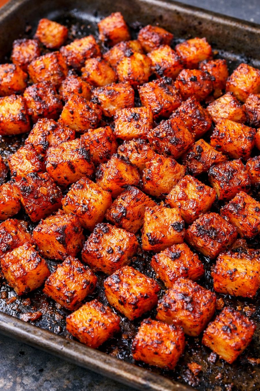 Continue roasting for another 10–15 minutes, or until the potatoes are deeply golden at the edges, crisp on the outside, and tender inside. The smoked paprika should look dark red and toasted but not blackened.