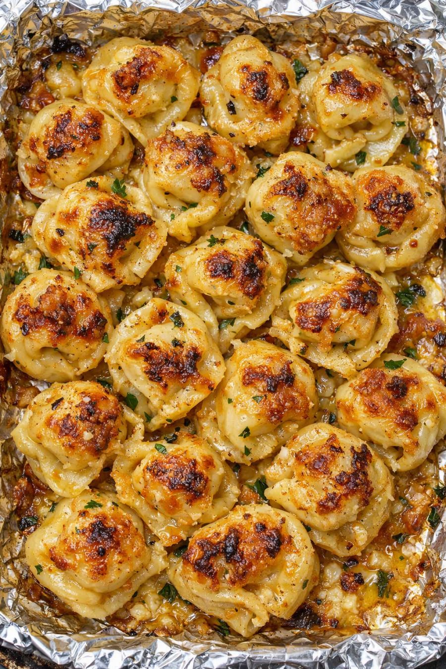 Remove from the oven and let the tortellini rest on the sheet for 3–5 minutes; the butter will settle into a silky sauce and the cheese crust will firm up slightly. Serve straight from the pan or transfer to a warm serving dish, spooning any garlic butter and crispy cheese bits from the foil over the top.