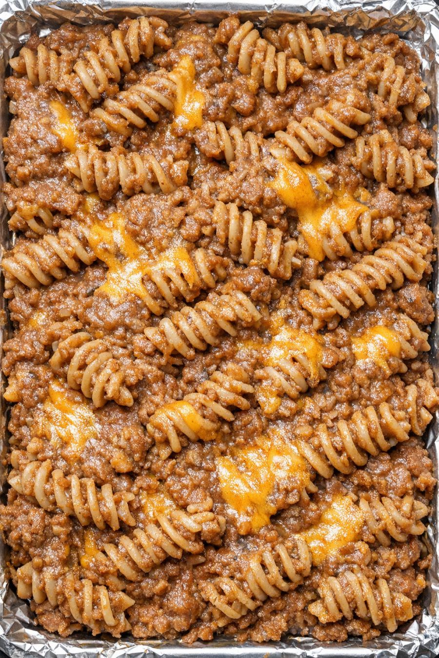 Once the pasta is cooked and the sauce is rich and dense, carefully transfer the hot mixture to the foil-lined baking sheet. Use a spatula or large spoon to spread it into an even layer all the way to the edges. This step helps it cool slightly and lets the sauce set into that hearty, burrito-style coating over every spiral.