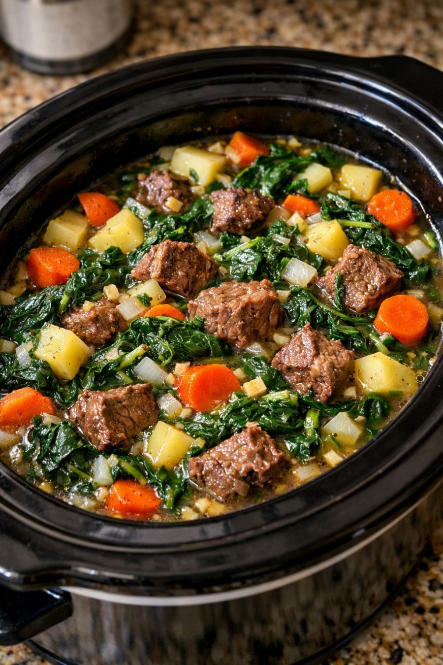 Ladle the hot stew into bowls, making sure everyone gets a good mix of beef, spinach, and broth. Serve warm with your favorite cozy sides.