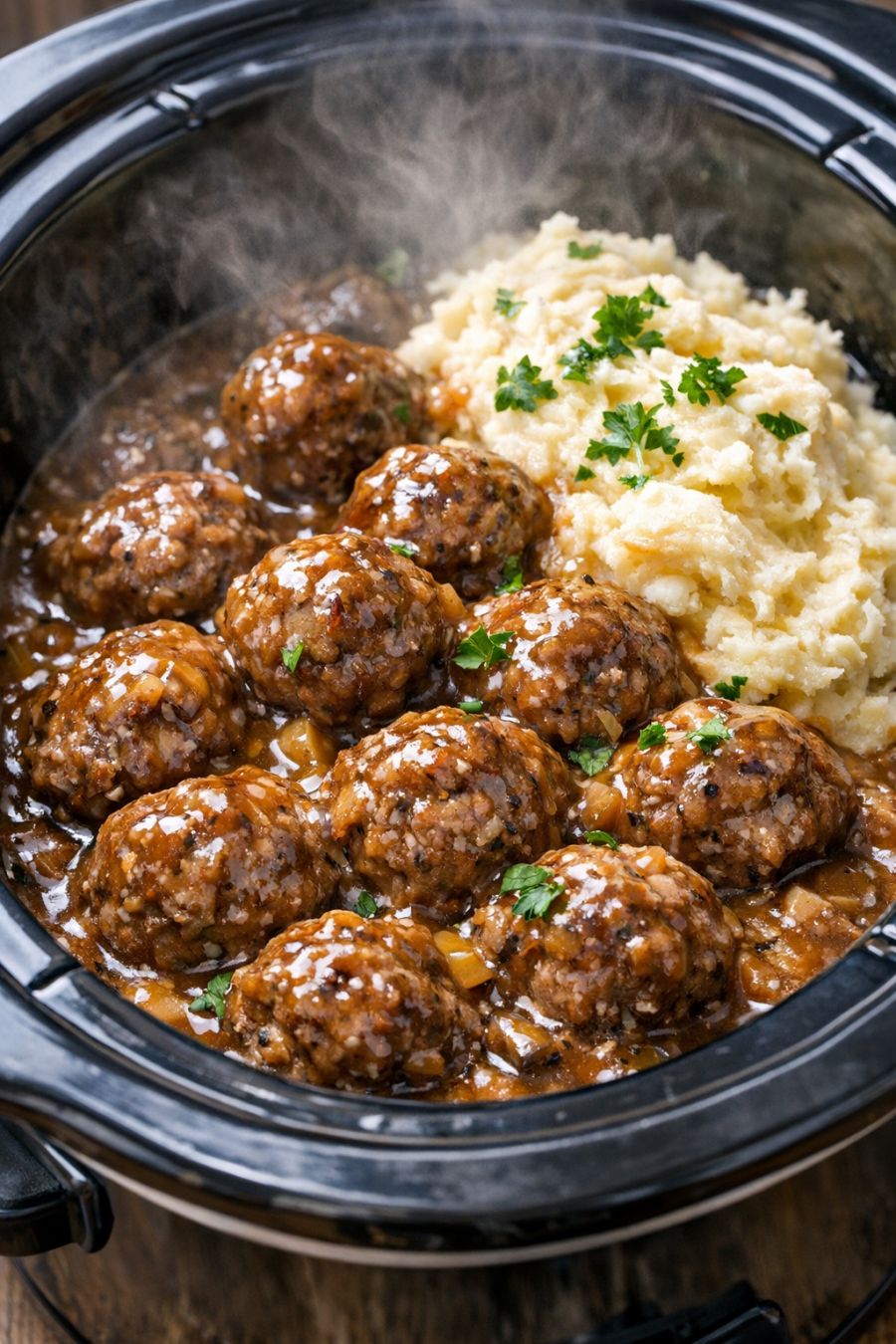 Switch the slow cooker to the WARM setting for serving. Spoon the meatballs and plenty of gravy over mashed potatoes, noodles, or rice, and serve right from the crock so everyone can help themselves to seconds.