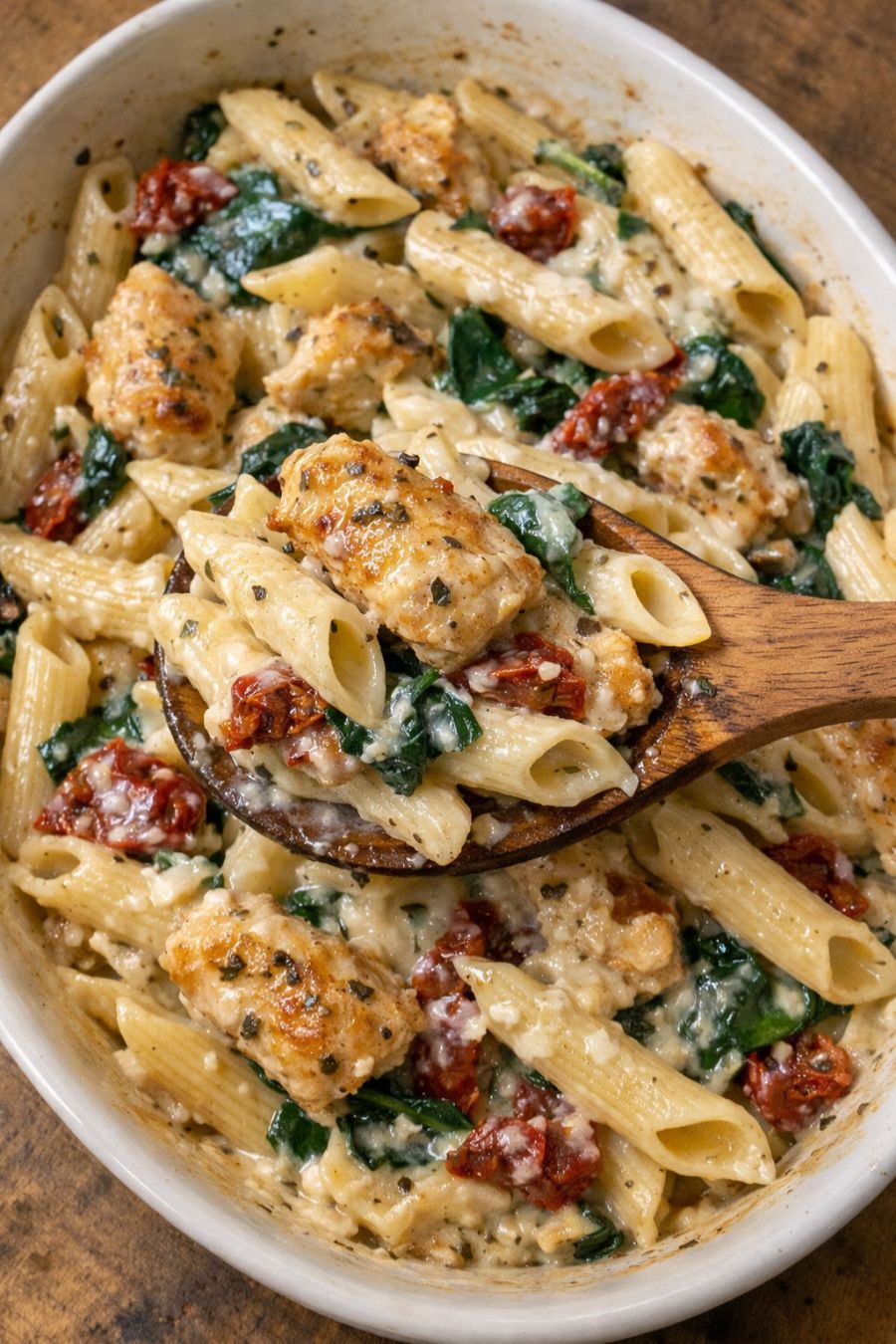 Let the pasta rest for 5–10 minutes before serving. This helps the sauce thicken slightly and makes it easier to scoop out those perfect, creamy spoonfuls with bits of golden chicken, sun-dried tomatoes, and wilted spinach, just like in the photo.