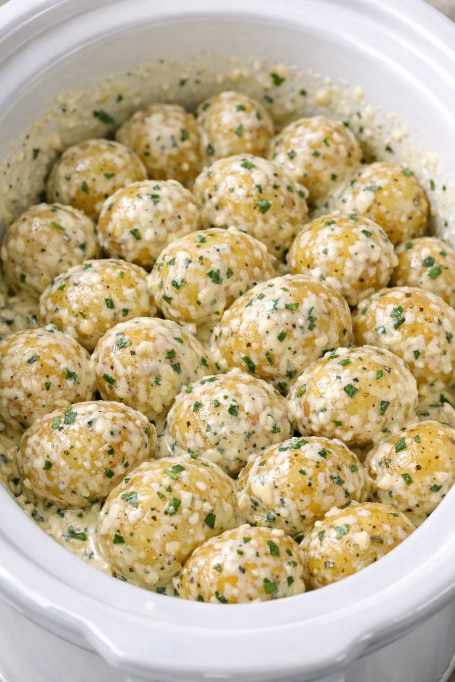 Serve the potatoes straight from the slow cooker, making sure to spoon plenty of the creamy herb sauce over each portion.