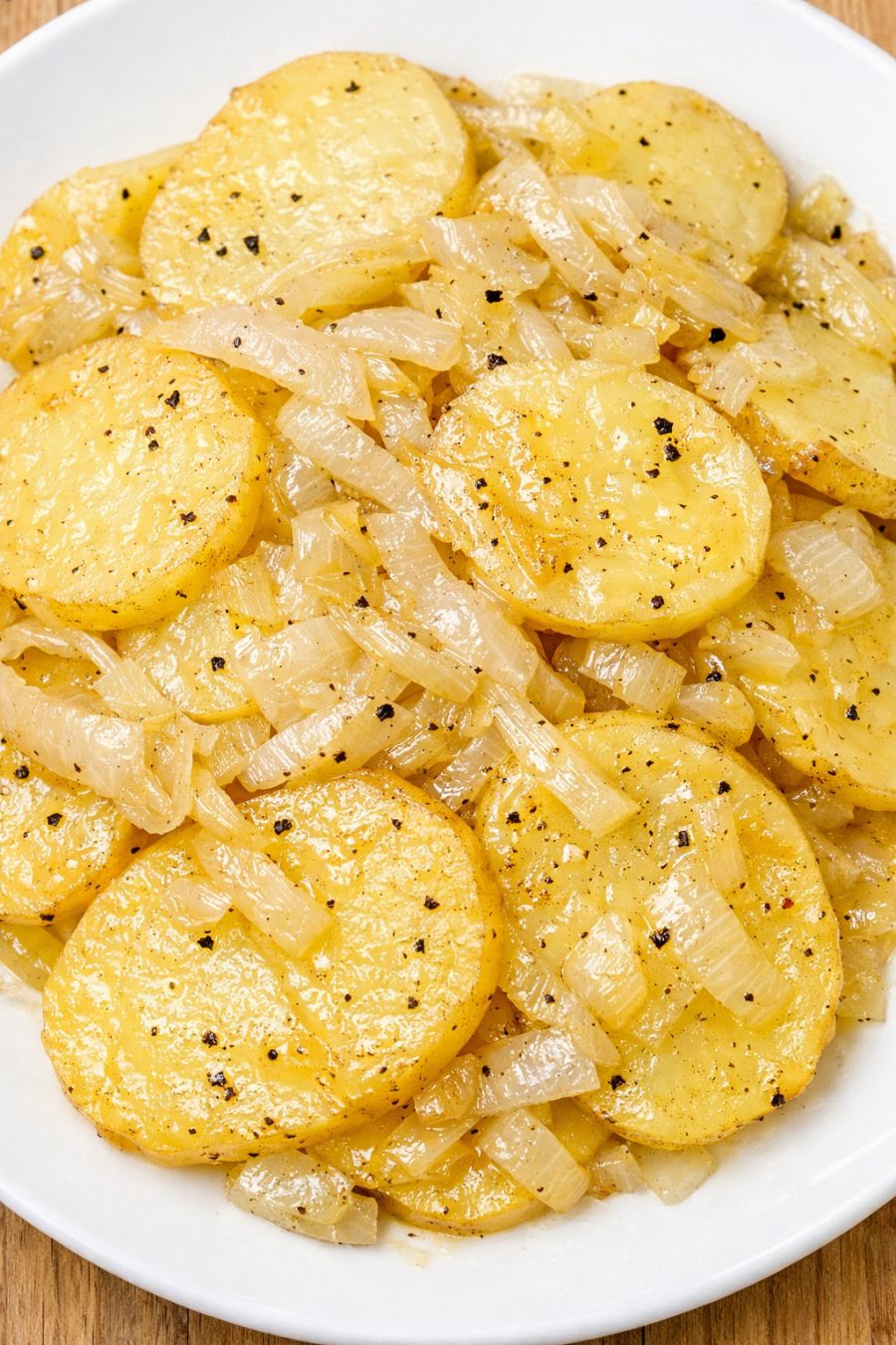 Serve: Spoon the potatoes and onions onto warm plates or into a serving bowl. You should see soft, golden potato slices with bits of caramelized, translucent onion glistening with butter and flecked with black pepper. Serve hot.