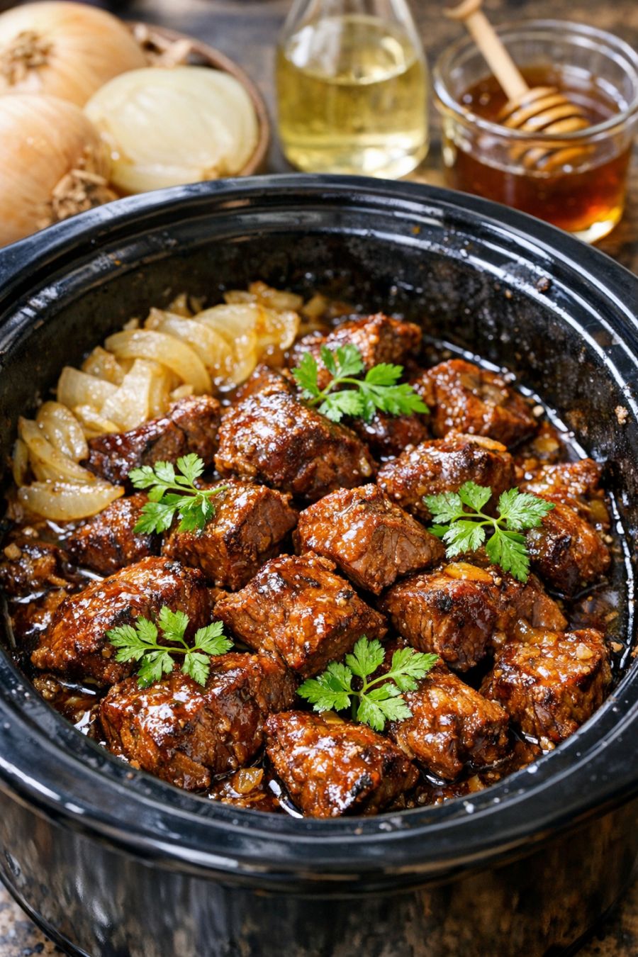 Food safety tips: Always start with fresh, properly refrigerated beef and keep it chilled until you’re ready to cook. Use clean cutting boards and knives, and wash your hands thoroughly after handling raw meat. Place the beef directly into the slow cooker and drizzle the Vidalia mixture over it; do not let the mixture with raw meat sit at room temperature for extended periods. Cook the beef until it reaches at least 145°F internally, though for this style of braised dish, it will typically be cooked beyond that to reach fork-tender texture. If you thicken the sauce with cornstarch, be sure the mixture comes back up to a simmer in the slow cooker to fully activate the starch. Refrigerate leftovers within 2 hours of cooking in shallow containers, and reheat to at least 165°F before serving again.