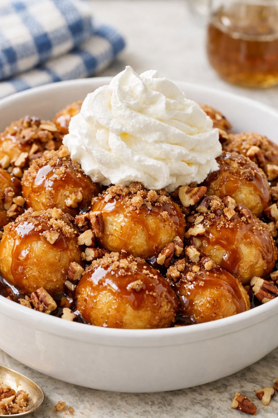 Once the donut holes are cooked through, gently spoon some of the caramel-cinnamon sauce over the top layer to glaze them. You can give them a very gentle stir if needed, but avoid overmixing so they don’t break apart.