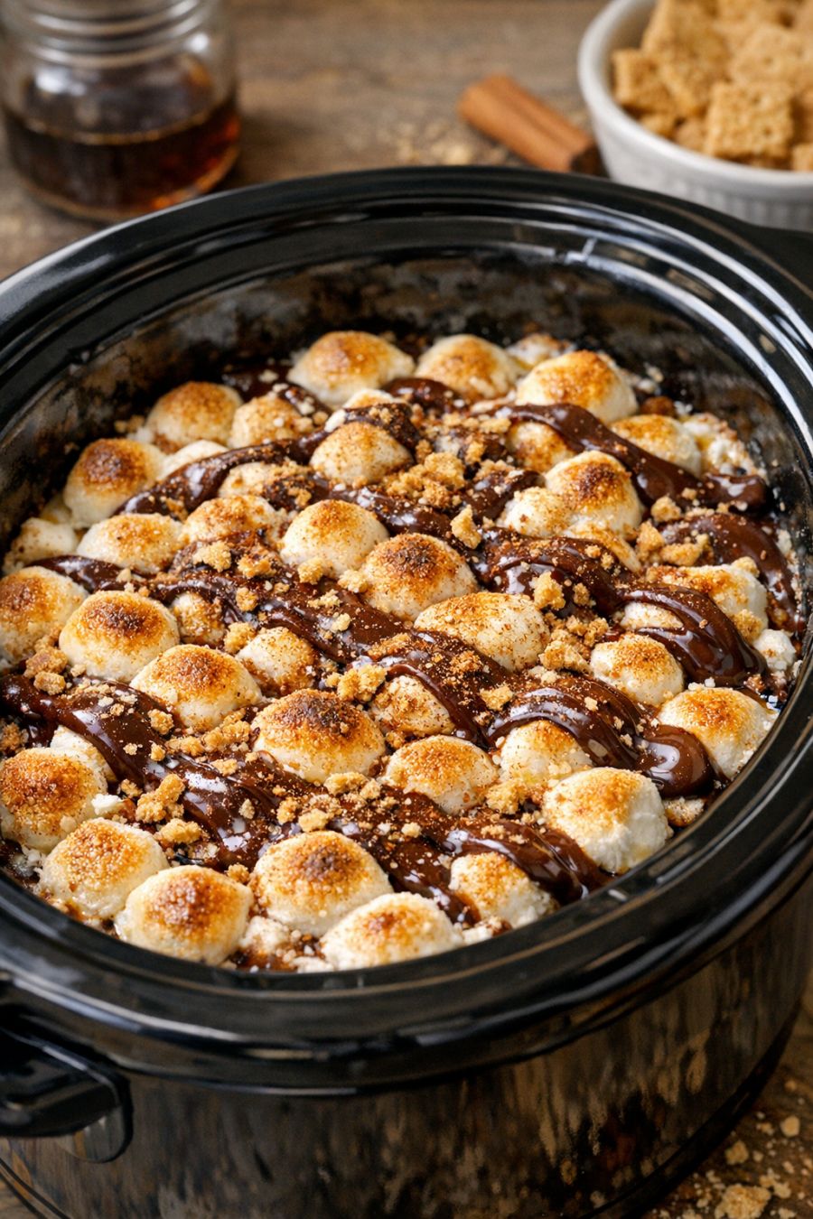 Cover the slow cooker with the lid and cook on LOW for 1 1/2 to 2 hours, or until the marshmallows are puffed and mostly melted, the chocolate is soft and glossy, and the edges are just starting to caramelize. Avoid lifting the lid in the first hour so the heat stays consistent.