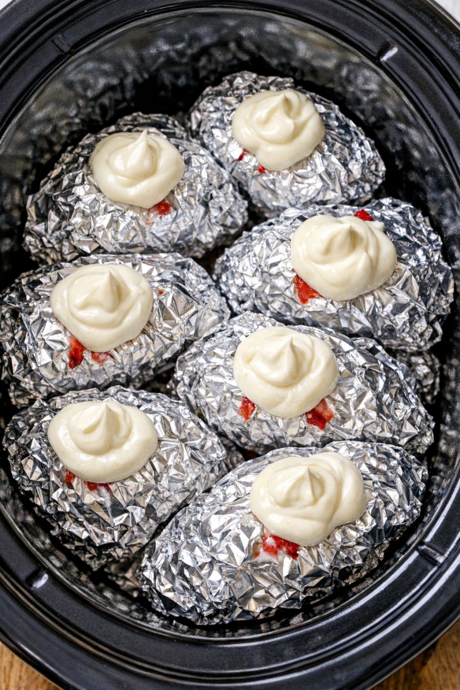 Place all of the foil packets in the bottom of a dry slow cooker, stacking gently if needed. Try to arrange them in a single, even layer first, then add a second layer on top if your slow cooker is small.