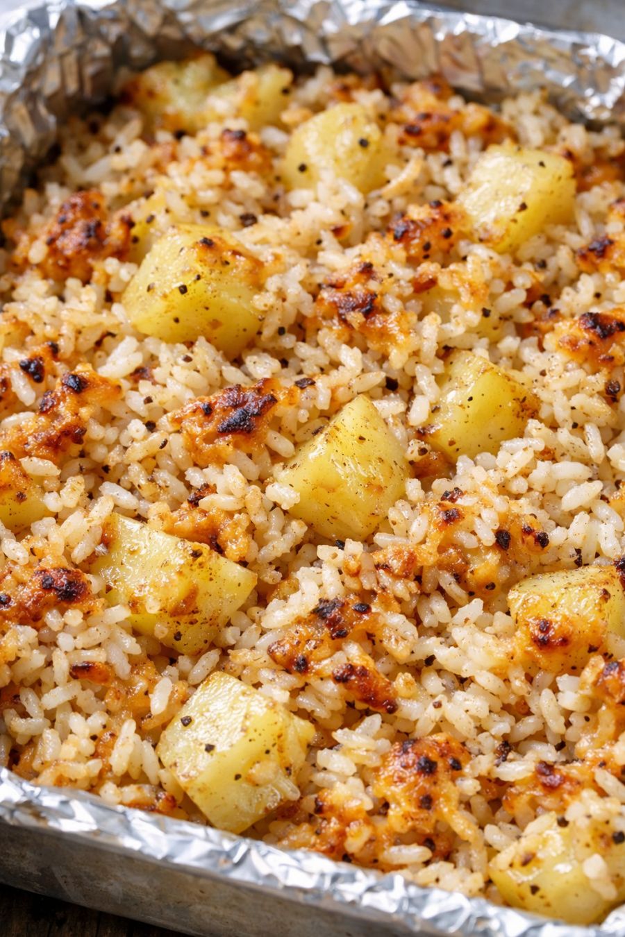 After 45 minutes, carefully remove the top foil (watch out for hot steam). Return the uncovered pan to the oven and continue baking for another 25–35 minutes, or until the potatoes are very tender when pierced with a fork, the rice is cooked and fluffy, and the top and edges are lightly browned and bubbling.
