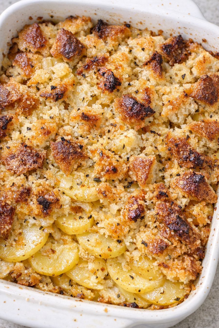 Remove the casserole from the oven and let it rest for at least 10 minutes before serving. This resting time allows the layers to set slightly, making it easier to scoop and helping the flavors meld. Serve warm, making sure each portion includes both the creamy potatoes and the crispy bread crust.