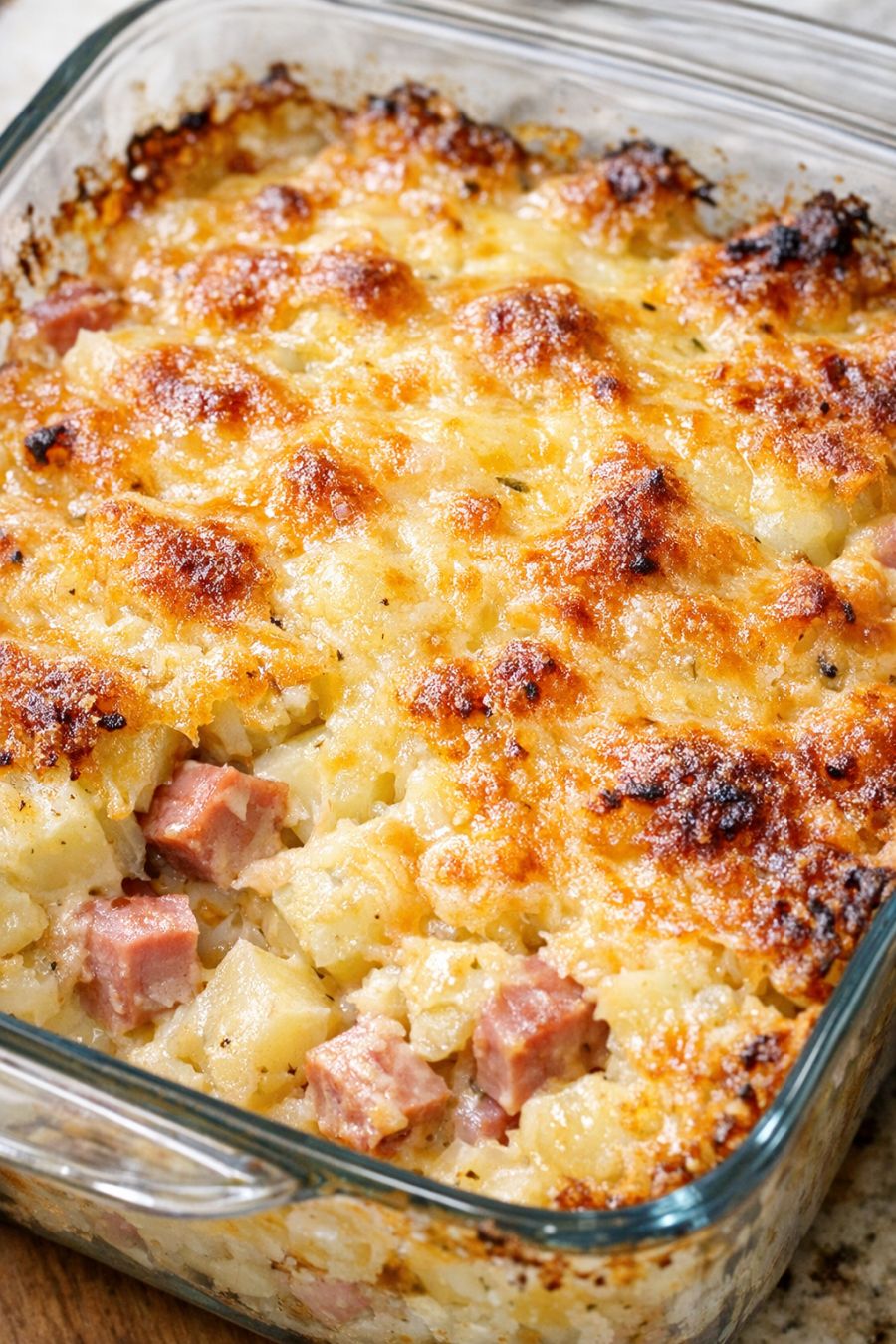 This oven baked 4-ingredients cheesy ham potato casserole is my no-fuss version of the dish my grandmother made every Easter with leftover ham. She’d slide a big glass baking dish into the oven, and the whole house would start to smell like melted cheese and crispy potatoes. It was the thing we all secretly looked forward to more than the ham itself. This simplified version keeps that same cozy, holiday feel, but it’s easy enough to throw together on a busy weeknight with just a few staples from the fridge and pantry.