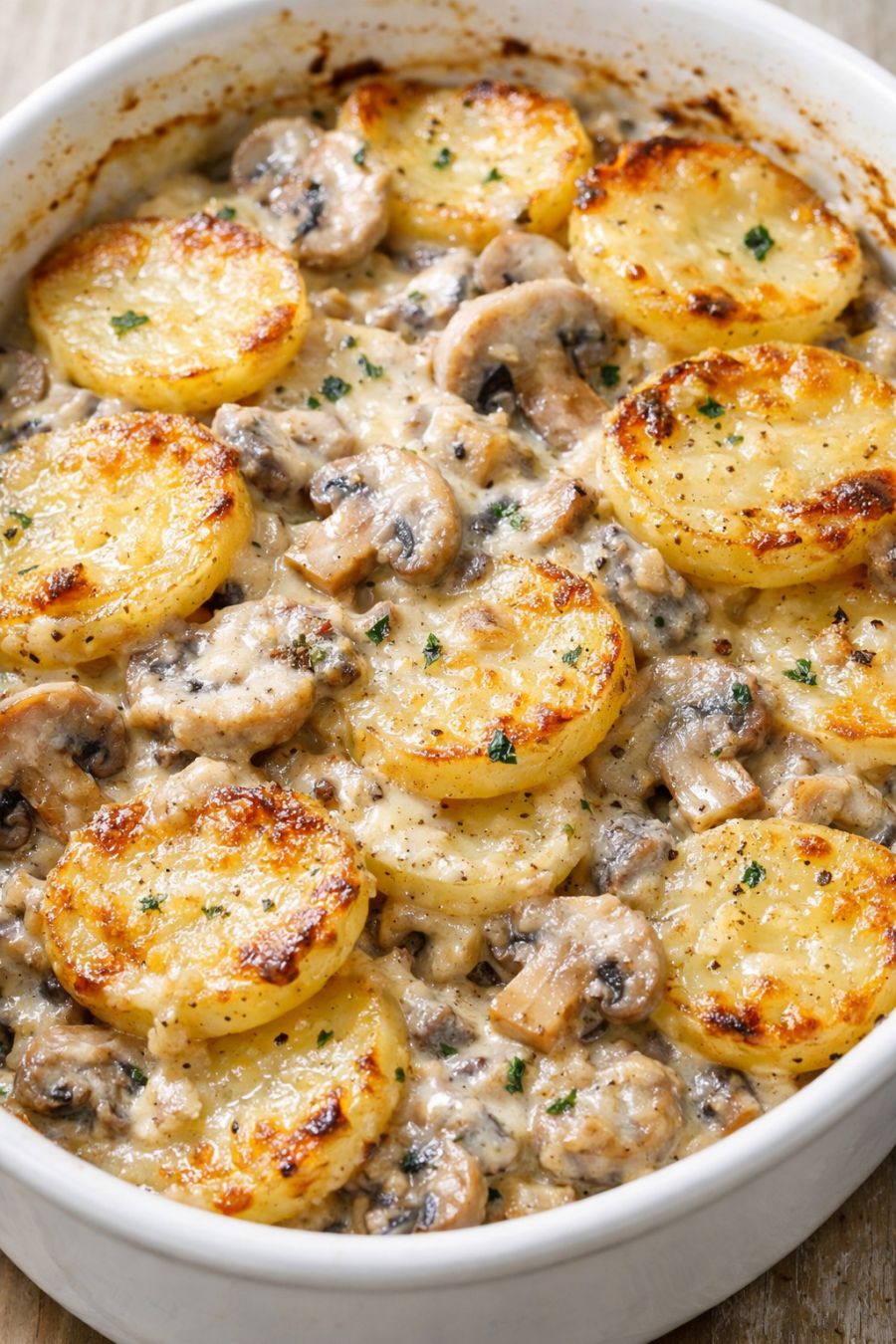 Spread a thin layer (2–3 tablespoons) of the mushroom mixture over the bottom of the baking dish. This helps keep the first layer of potatoes from sticking.