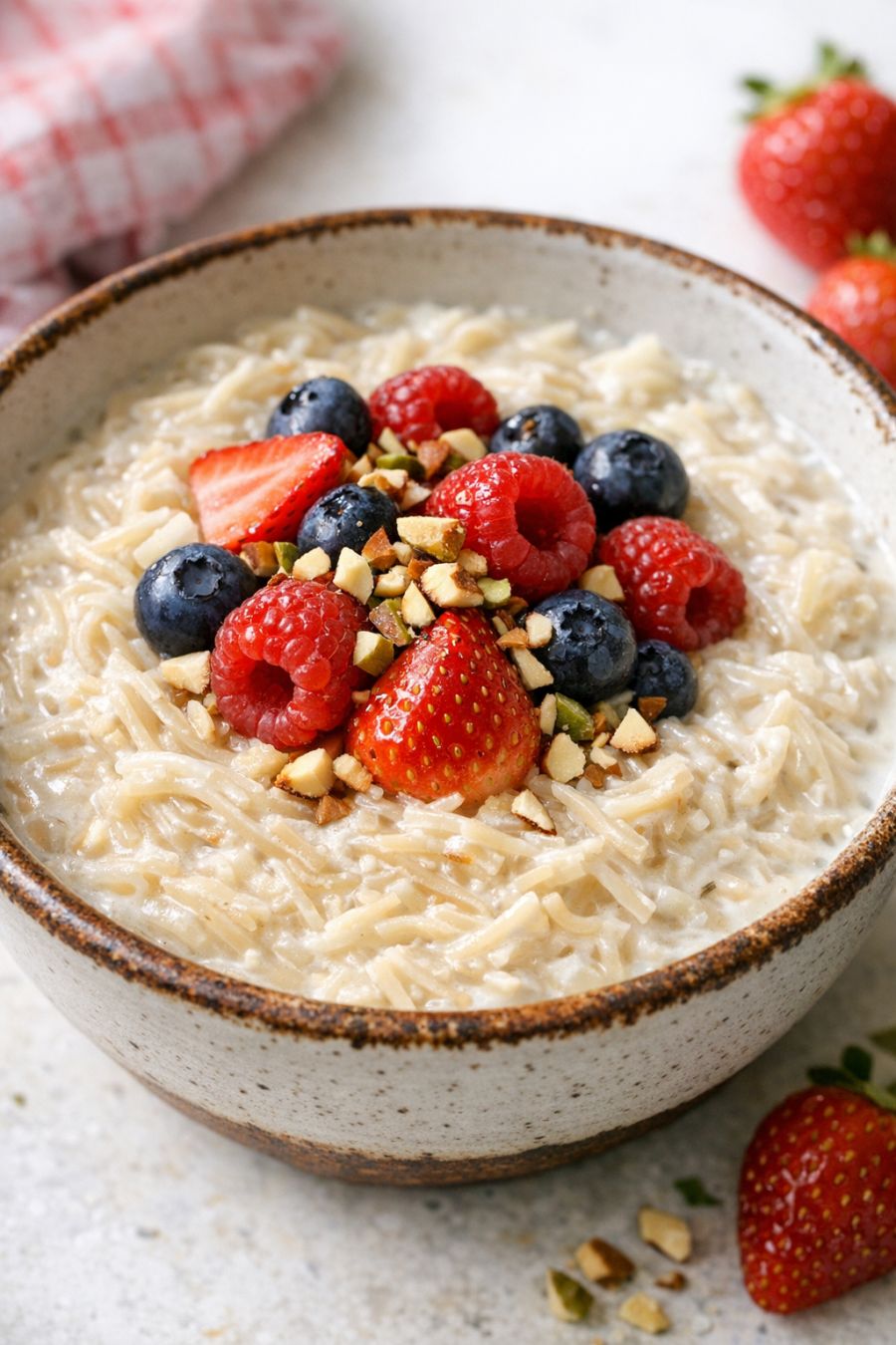 Serve this vermicelli dessert warm in small bowls, topped with a little extra cold milk or cream if you like a looser, more pudding-like texture. It pairs beautifully with fresh spring berries, sliced strawberries, or a simple fruit salad on the side. A cup of hot coffee, black tea, or a light herbal tea (like chamomile or mint) balances the sweetness nicely. For a more indulgent spin, add a small scoop of vanilla ice cream or a dollop of whipped cream on top just before serving so it melts into the warm noodles.