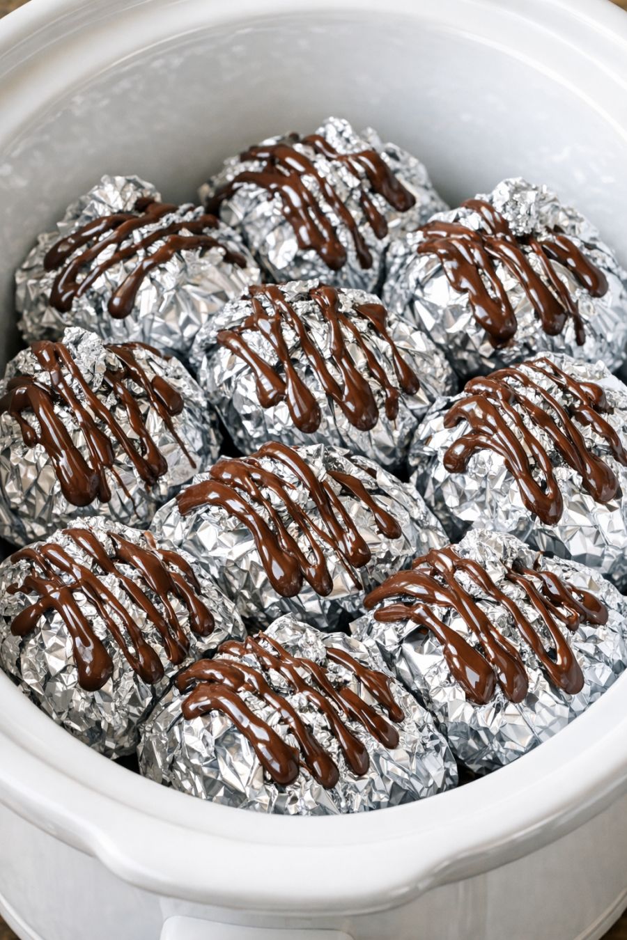 Drizzle the melted chocolate over the tops of the foil-wrapped domes right in the slow cooker, letting it run down the sides a bit for a fun, messy look. This is what gives that shiny, drizzled effect on the outside of each little package.