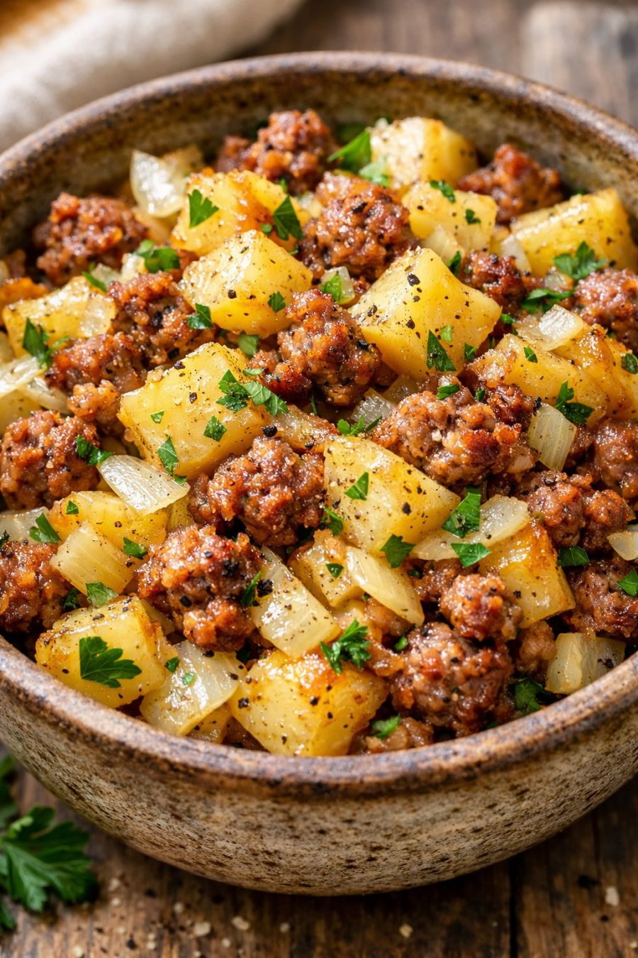 This is the sort of farmhouse supper I make on autopilot, the way my mother and her Amish neighbors used to cook on busy chore days. You just tumble raw diced potatoes into the slow cooker, crumble seasoned ground sausage over the top, and add three simple pantry staples to help it all melt together into something hearty and comforting. It’s not fancy, just honest meat-and-potatoes cooking that fills the house with the kind of smell that makes everyone drift toward the kitchen without even realizing it.
