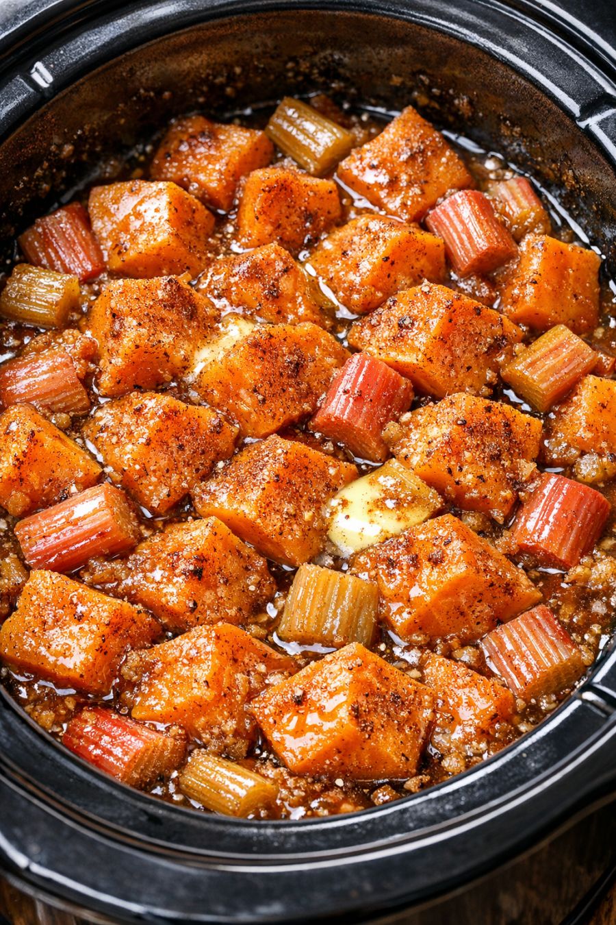 Cover the slow cooker with the lid and cook on LOW for 4 to 5 hours, or on HIGH for 2 to 2 1/2 hours, until the sweet potatoes are very tender when pierced with a fork and the rhubarb has broken down into a soft, jammy texture.