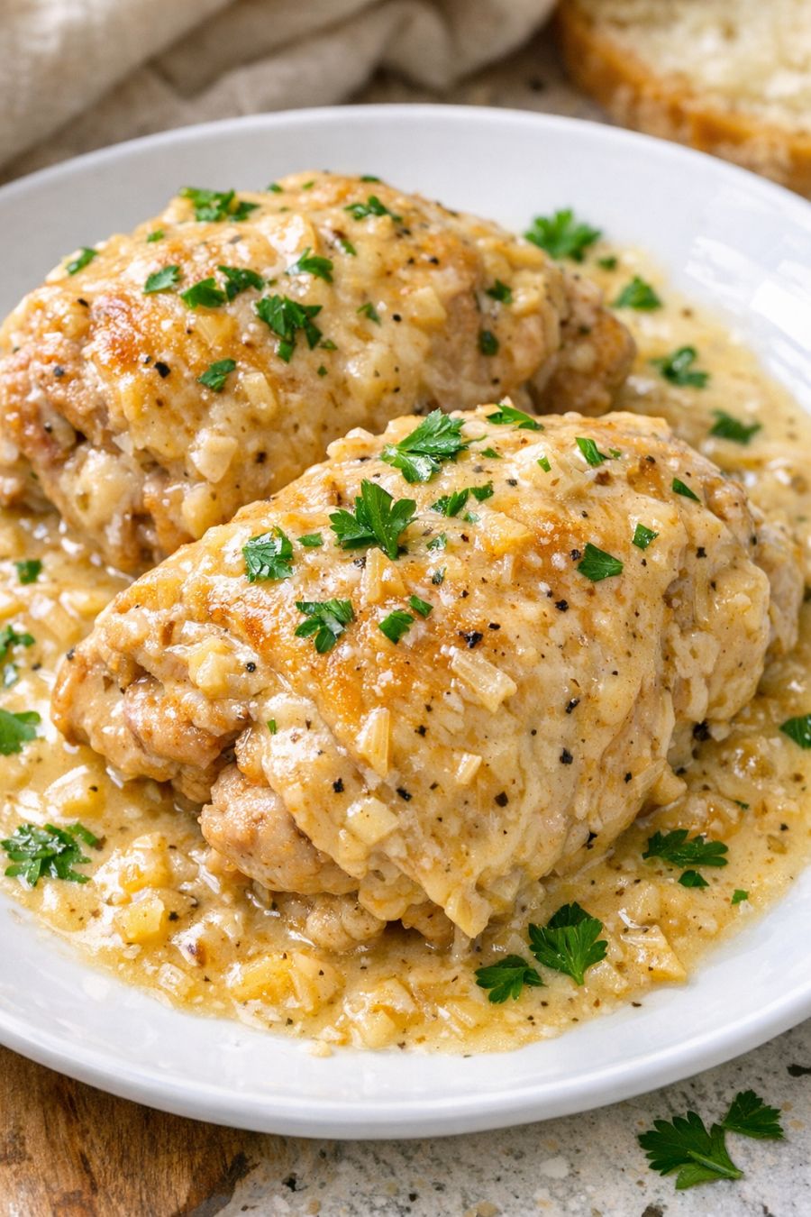 Once cooked, gently shred the chicken directly in the slow cooker using two forks, or leave the thighs whole if you prefer larger pieces. Stir the chicken into the sauce so everything is coated and the gravy loosens slightly from the juices.