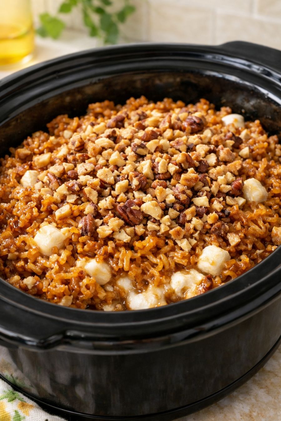 Once the dessert is cooked, turn off the slow cooker and let it sit, covered, for 10 to 15 minutes. This resting time helps the caramel thicken a bit and cling to the noodles, giving you a chewy-crunchy texture.
