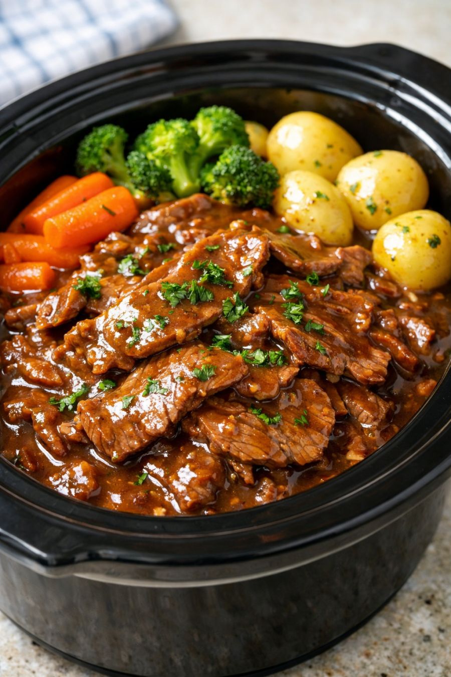 Once cooked, give everything a gentle stir to break up the beef slices and mix them into the gravy. Taste and adjust seasoning if needed with a pinch of salt or black pepper, keeping in mind the onion soup mix is already salty.