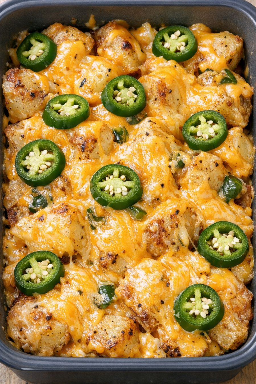 Rest before serving: Let the jalapeño cheddar potatoes rest on a heat-safe surface for about 10 minutes before serving. This helps the cheese set slightly so it’s easier to scoop, while still staying gooey and stretchy. Serve warm straight from the dark casserole dish, making sure each scoop gets plenty of bright green jalapeño slices and melted orange cheddar on top.