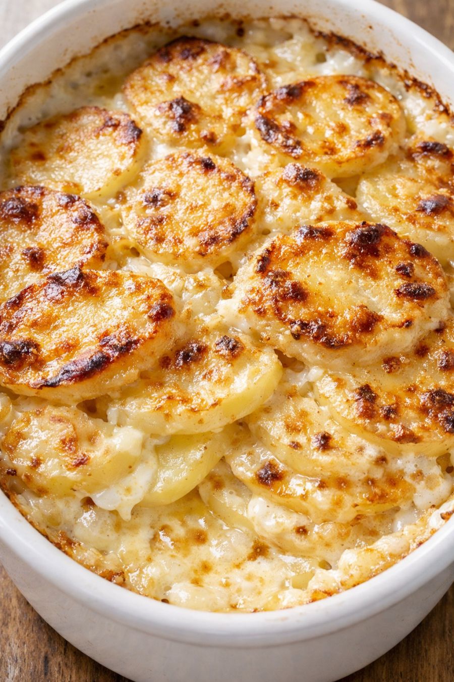 Let the scalloped potatoes rest on a cooling rack for at least 10–15 minutes before serving. This short rest helps the creamy sauce thicken slightly so the layers hold together when you scoop or slice into them. Taste and sprinkle with a tiny bit more salt on top if needed, then serve warm straight from the baking dish.