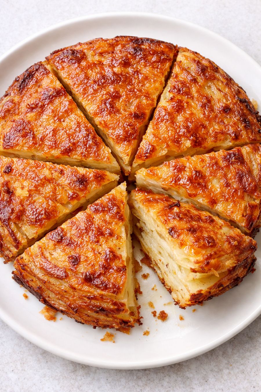 Slice the potato galette into wedges, like a pie. Serve right away while the edges are still crisp and the center is tender. If you’re serving it for a holiday brunch like Easter, you can keep it warm in a low oven (around 200°F/95°C) for 15–20 minutes before bringing it to the table.