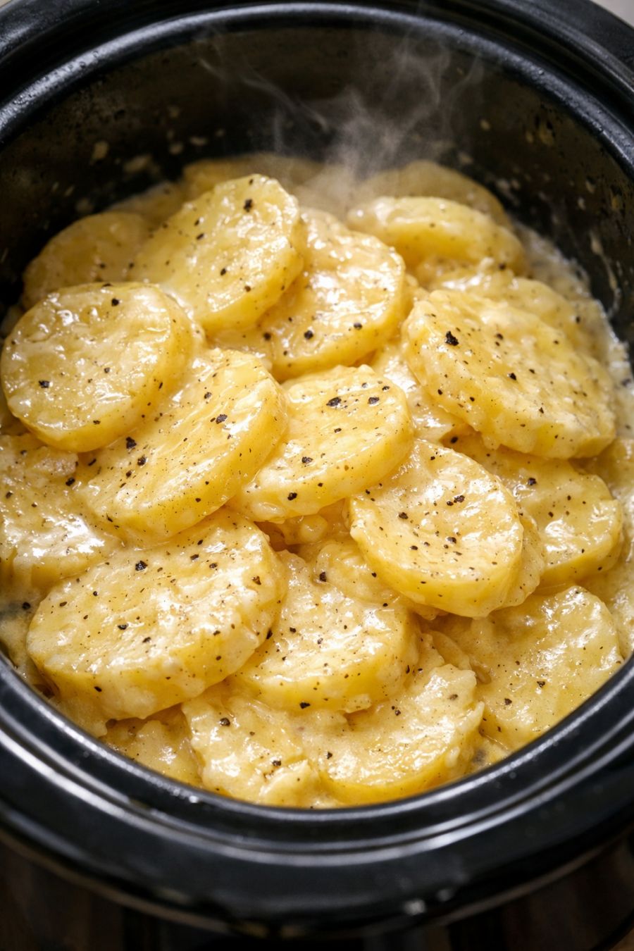 For a cheesier version, stir in 1 to 1 1/2 cups of shredded cheddar or Colby Jack during the last 20 minutes of cooking, then cover until melted. To add a little onion flavor without complicating things, scatter 1/2 cup very thinly sliced onion or 1 teaspoon onion powder over the potatoes along with the salt and pepper. If you like a hint of garlic, add 1/2 to 1 teaspoon garlic powder with the seasonings. For a more traditional Amish farmhouse feel, you can swap part of the half and half for heavy cream for extra richness, or use evaporated milk in place of some of the half and half if that’s what you keep in your pantry. You can also add a pinch of paprika on top before serving for a touch of color. Food safety tips: Keep the potatoes refrigerated after slicing if you’re prepping ahead, and do not let raw sliced potatoes or the finished dish sit at room temperature for more than 2 hours. Always cook on LOW or HIGH as directed with the lid on to ensure the potatoes reach a safe temperature, and refrigerate leftovers within 2 hours in shallow containers. Reheat leftovers thoroughly until steaming hot before serving.