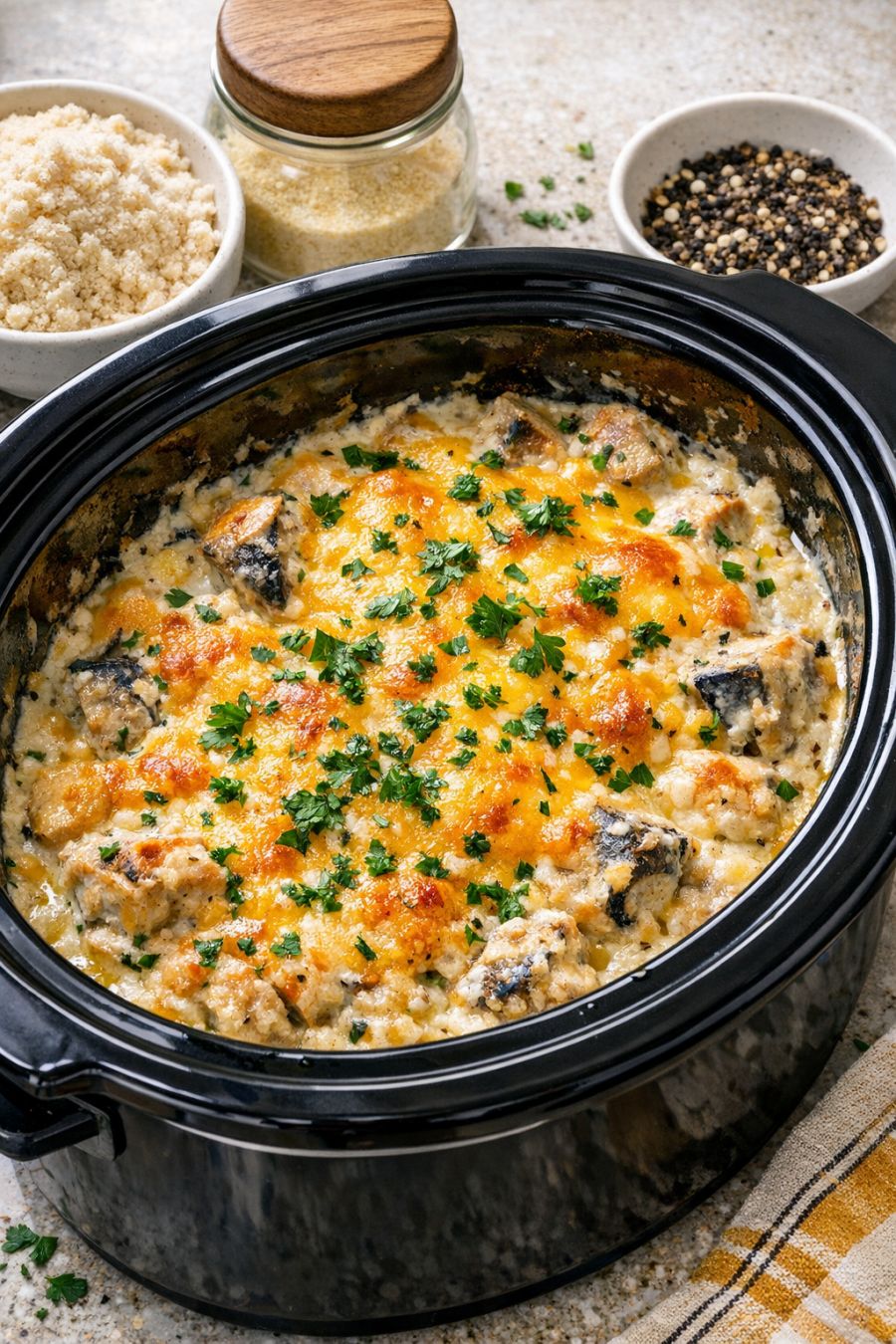Cover the slow cooker with the lid and cook on LOW for 3–4 hours or on HIGH for 1.5–2 hours, until the sauce is hot and bubbly around the edges and the cheese on top is fully melted. Avoid lifting the lid too often so the mixture heats evenly.