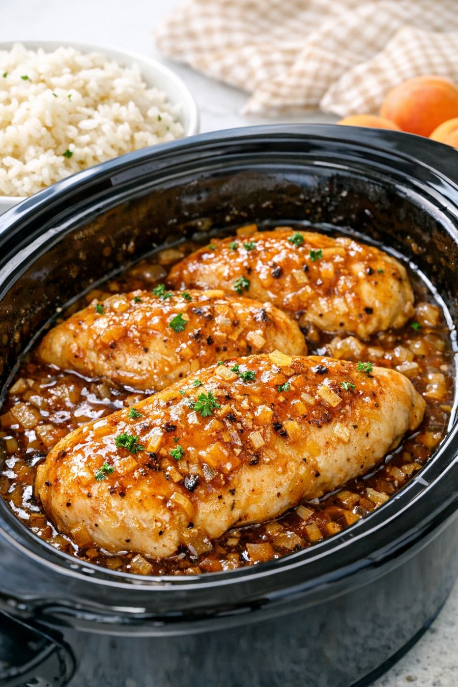 Serve the chicken hot, spooning plenty of the apricot-onion sauce from the slow cooker over each portion.