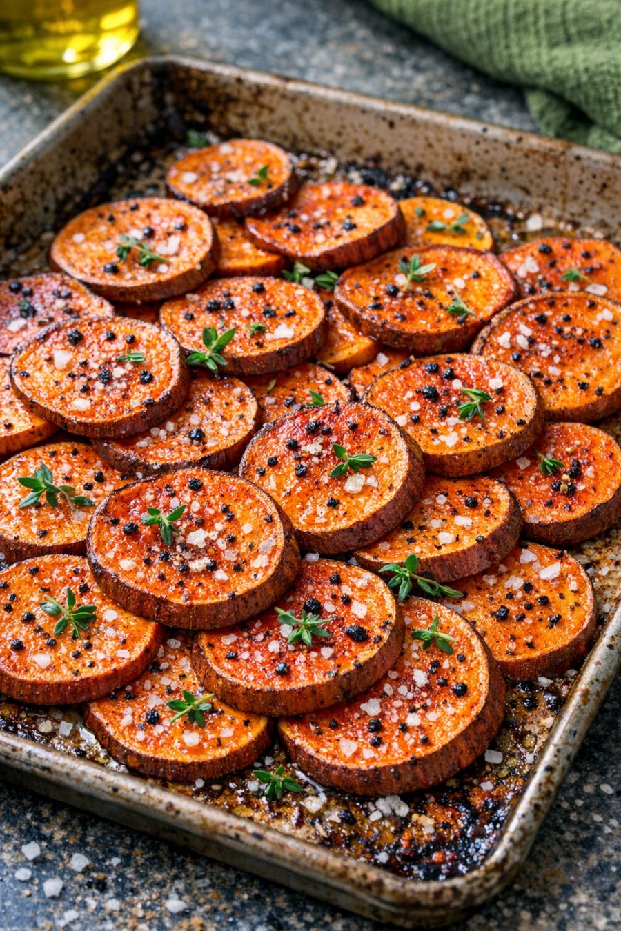 Drizzle the olive oil evenly over the sweet potato slices in the pan. Sprinkle the salt, black pepper, smoked paprika, minced garlic, and thyme leaves over the top.
