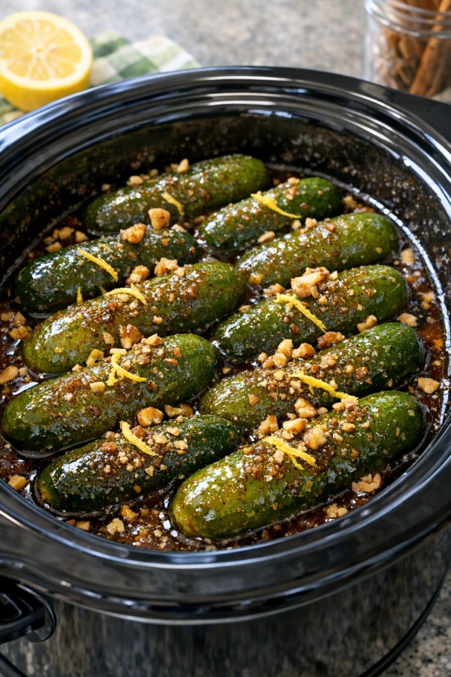 Cover the slow cooker with the lid and cook on LOW for 3 to 4 hours, or until the cucumbers are very tender when pierced with a knife and have released plenty of liquid, forming a light syrup in the bottom of the cooker.