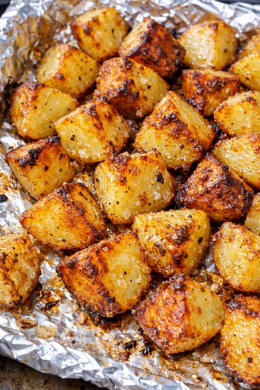 These potatoes are rich and savory, so they’re perfect next to classic roast meats like chicken, beef, or pork, or even with simple pan-seared sausages. I love them with a green veggie on the side—steamed green beans, roasted Brussels sprouts, or a quick salad with a sharp vinaigrette to cut through the richness. They’re also amazing as a brunch side with fried or poached eggs and a little hot sauce. If you’re entertaining, serve them straight from the foil-lined tray so everyone can grab the crispiest pieces right off the pan.