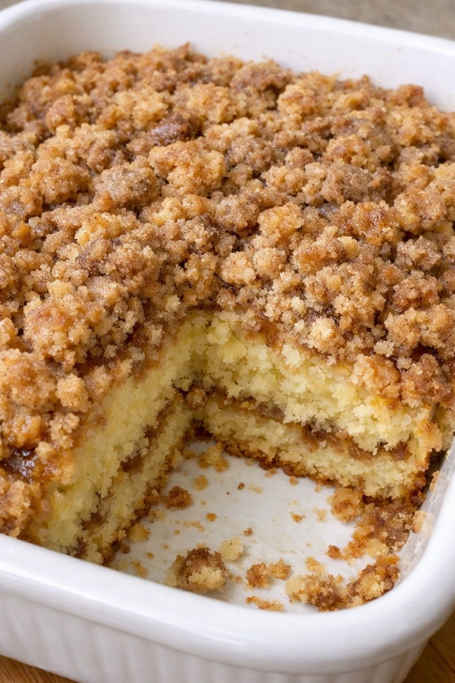 Remove the coffee cake from the oven and let it cool in the dish on a wire rack for at least 10–15 minutes. This helps it set up so you can scoop or slice clean pieces while it’s still warm and cozy.