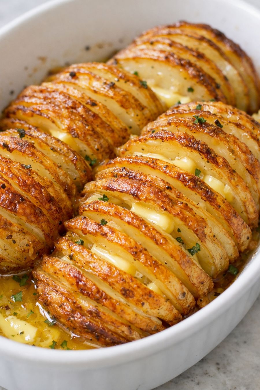 Serve these crispy potato fans straight from the baking dish while the butter is still bubbling between the layers. They pair beautifully with roasted or grilled chicken, meatloaf, ham, or a simple green salad for a lighter plate. At potlucks, I like to set them next to the main casserole and a bowl of sour cream or plain yogurt for dolloping. They also make a great brunch side alongside scrambled eggs or a frittata, and any leftovers reheat nicely in a hot oven or skillet until the edges crisp back up.