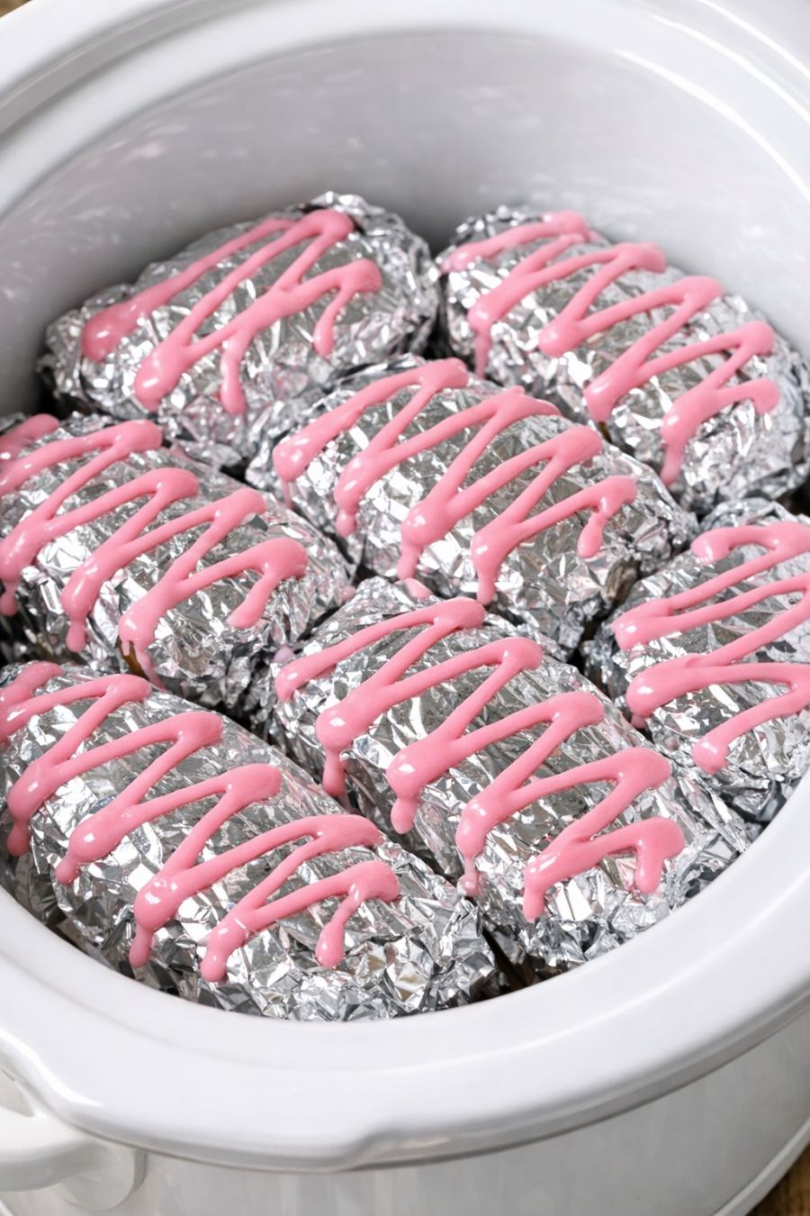Serve the foil packets warm right out of the slow cooker, drizzled with the pink lemonade icing and maybe a little extra spoonful of the warm sauce from the bottom of each packet. These are great on their own, but they’re extra dreamy with a scoop of vanilla ice cream, a dollop of whipped cream, or a handful of fresh berries on the side. For a brunch spread, line the foil packets up in the slow cooker and let everyone open their own at the table—kind of like dessert presents. A cup of hot coffee, iced tea, or sparkling water with a lemon slice balances the sweetness perfectly.