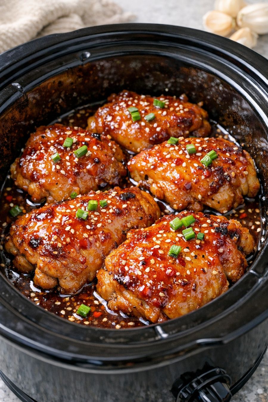 Pour the sweet chili mixture evenly over the chicken thighs in the slow cooker, making sure each piece is coated. Use a spoon to gently nudge the sauce around if needed so it gets between the pieces of chicken.