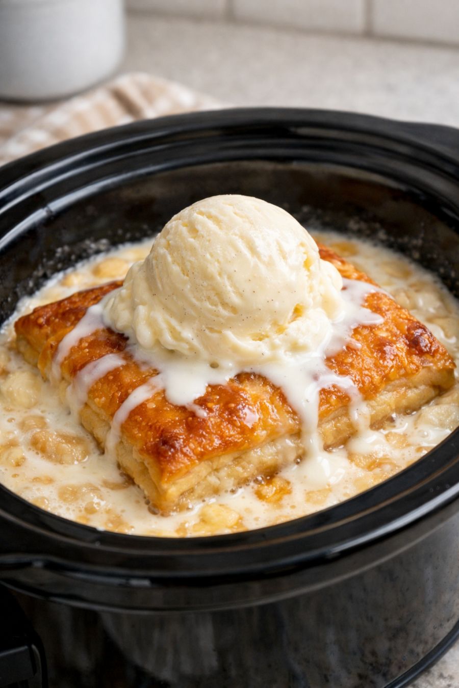 Cover the slow cooker with the lid and cook on LOW for 2 to 2 1/2 hours, or until the pastries have softened, puffed slightly, and the edges look set and golden around the sides. The center should be soft and custardy but not completely liquid.