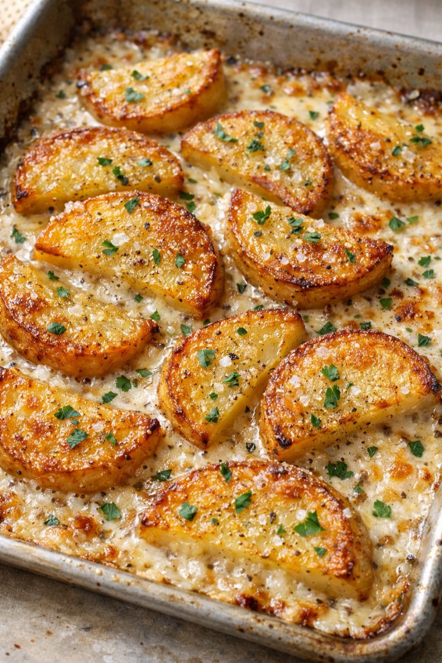 Pour the seasoned milk mixture evenly over the potatoes on the baking sheet. The potatoes should be partially submerged in the cloudy liquid, with some slices peeking out on top.