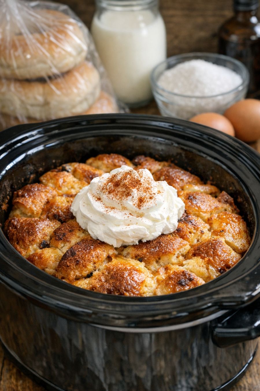 This cozy slow cooker dessert is exactly the kind of budget-friendly treat I love to make for family gatherings like Mother’s Day. You start with frozen plain bagels—yes, really—and let them soak up a simple mix of pantry staples right in the crock. A few hours later, those humble bagels transform into a soft, sweet baked-style treat that tastes like a cross between bread pudding and a cinnamon roll. It’s the kind of no-fuss dessert that lets you spend more time with your kids and grandkids and less time hovering over the oven.
