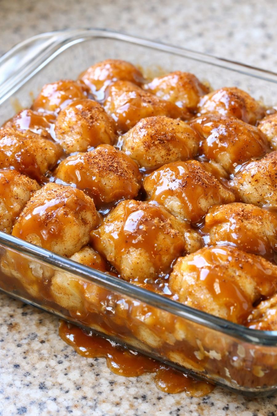Serve this pull-apart dessert warm, straight from the glass casserole dish, with small plates or bowls so everyone can grab a few gooey pieces. A scoop of vanilla ice cream or a dollop of lightly sweetened whipped cream is lovely against the caramelized sauce. For a simple contrast, pair it with hot coffee, black tea, or a glass of cold milk. If you’d like to turn it into more of a brunch centerpiece, serve alongside fresh berries, a citrus salad, or savory egg dishes to balance the sweetness.
