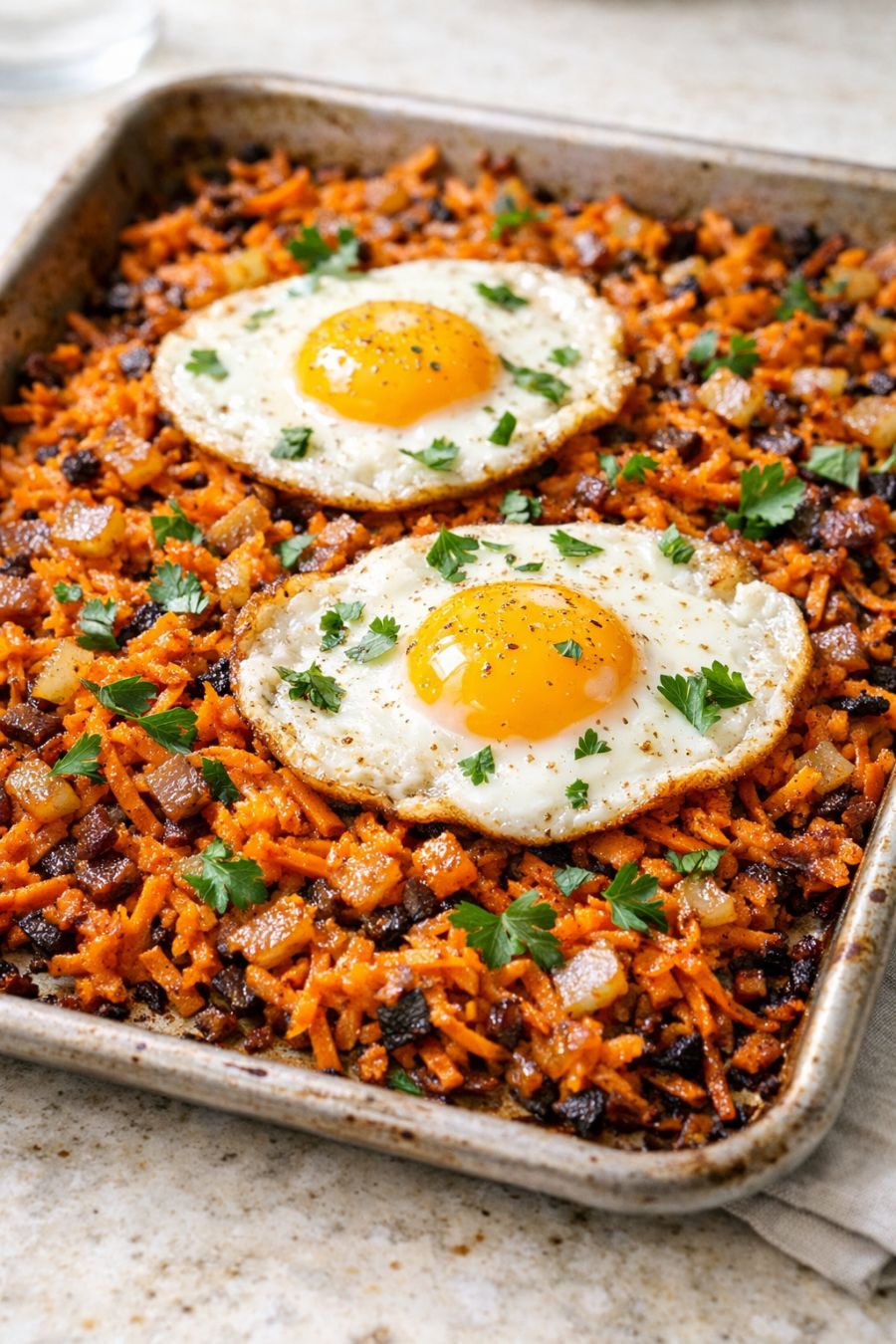 Serve this sweet potato hash hot right from the sheet pan with fried or scrambled eggs on top and a side of crispy bacon or sausage. A simple green salad or sliced fresh fruit balances the sweetness nicely. For brunch with friends, I like to set out toppings—shredded cheese, sliced green onions, hot sauce, and avocado—so everyone can dress up their own portion. It also makes a great base for breakfast bowls with black beans, salsa, and a dollop of Greek yogurt.