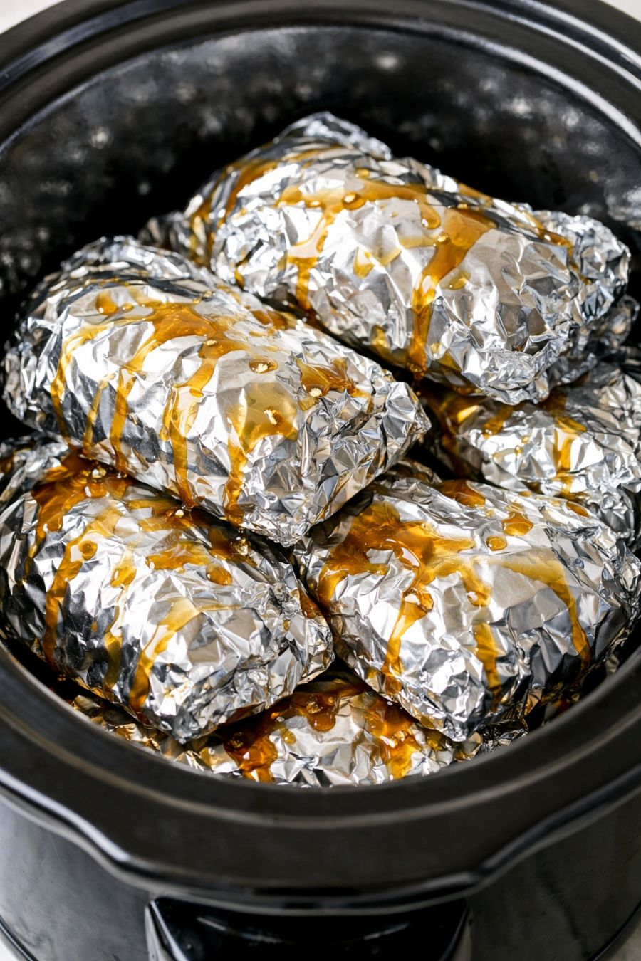 Arrange the sealed foil packets in the slow cooker in a single layer as much as possible, stacking slightly if needed. The shiny foil packets should fit snugly but not be crushed.