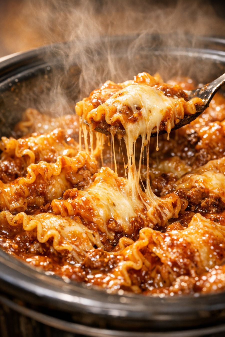 Turn the slow cooker to WARM and let the pasta sit, covered, for 5 to 10 minutes to thicken slightly. The sauce will cling to the ruffled edges, and you should see steam rising as you lift the lid. Serve straight from the slow cooker, scooping down to get both the creamy sauce and the stretchy top layer of cheese in each portion.